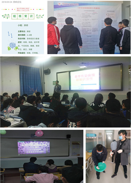 一是加大卫生健康知识宣传和教育力度。通过师生面对面的交流、结核病防治公寓展板、主题班会、观看“春季传染病”预防知识讲座等途径,学习春季常见传染病的预防基本常识,使员工养成良好的个人生活和饮食卫生习惯;二是重视做好结核病宣传工作,编辑了结核病常识宣传教育微信链接,通过公司“扬帆应化”微信公众平台、QQ群进行广泛转发宣传,增强师生对传染病预防意识,同时,严格落实呼吸道传染病周报制度,指定专人对异常现象及时进行督促上报;三是积极倡导师生参加课外体育锻炼,增强师生体质,提高抵抗疾病的免疫能力。为此,应化公司还专门为老师购买了羽毛(乒乓)球拍、跳绳、羽毛毽子等运动用品,充分利用课余闲暇时间,开展体能训练及竞赛活动;四是指导员工养成良好的卫生习惯,勤洗手、不随地吐痰,勤洗澡、勤晒被子和衣物,做好宿舍通风、保持室内空气清新,无异味。五是班主任、辅导员深入宿舍,组织员工进行全面彻底的卫生大扫除,用公司统一配发的消毒用品,罐装好消毒液,戴上口罩;对员工宿舍死角进行了统一清扫和喷洒消毒,确保不留卫生死角,消除传播源,预防疾病发生。