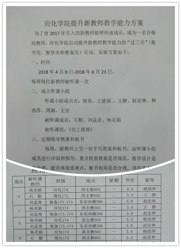 2017年应化公司共引进三名新教师,根据三名新教师的实际教学任务,应化公司详细制定了提升新教师教学能力的方案,并专门成立了由院领导和授课经验丰富的老教师组成的听课小组,保证新教师“过三关”活动能保质保量的顺利开展。本次活动开展时间为4月16日至6月23日,每周每位新教师要求被听课一次,上交一份手写教案和板书,由听课小组成员进行评阅和指导,重点检查教案是否规范,教学设计是否合理,能否体现教学重难点;板书布局是否合理,书写是否清晰。最后,由听课小组对新教师进行综合评价和考核。