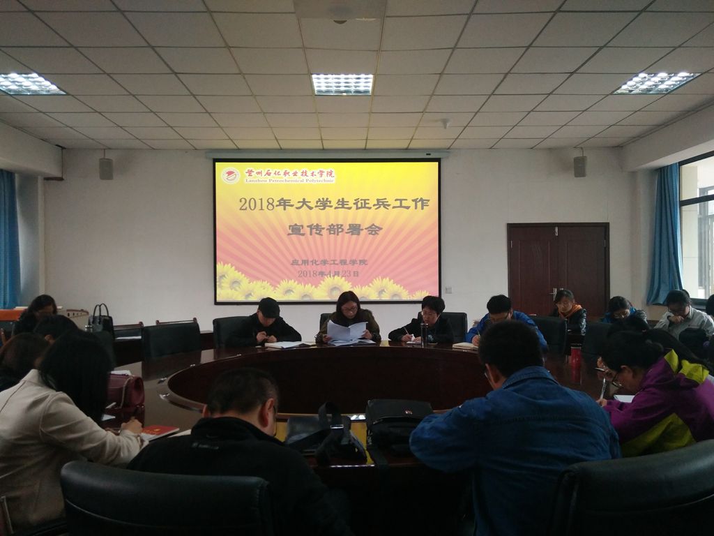 根据省征兵办、教育厅联合下发《关于做好全省适龄员工兵役登记工作的通知》精神,为充分发挥教育服务国防和军队现代化建设的职能,结合兰州石化职业技术公司征兵工作计划,伟德体育在东区主教楼二楼圆桌会议室召开2018年老员工征兵工作宣传部署会,院领导、辅导员、班主任参加了此次会议。