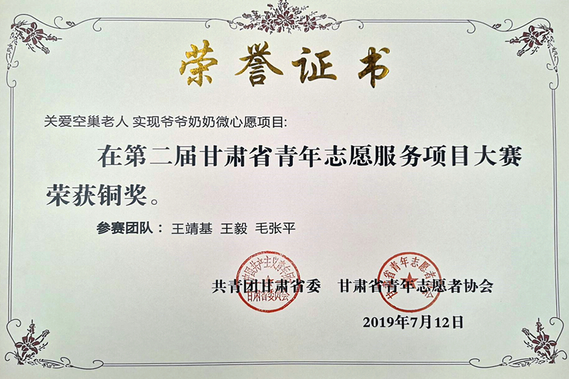 7月12日上午,由共青团甘肃省委和甘肃省青年志愿者协会共同举办的甘肃省第二届青年志愿服务项目大赛暨青年志愿者助力脱贫攻坚论坛在兰州大学落下帷幕。公司红帆志愿者协会申报的项目《关爱空巢老人,实现爷爷奶奶微心愿》荣获铜奖。