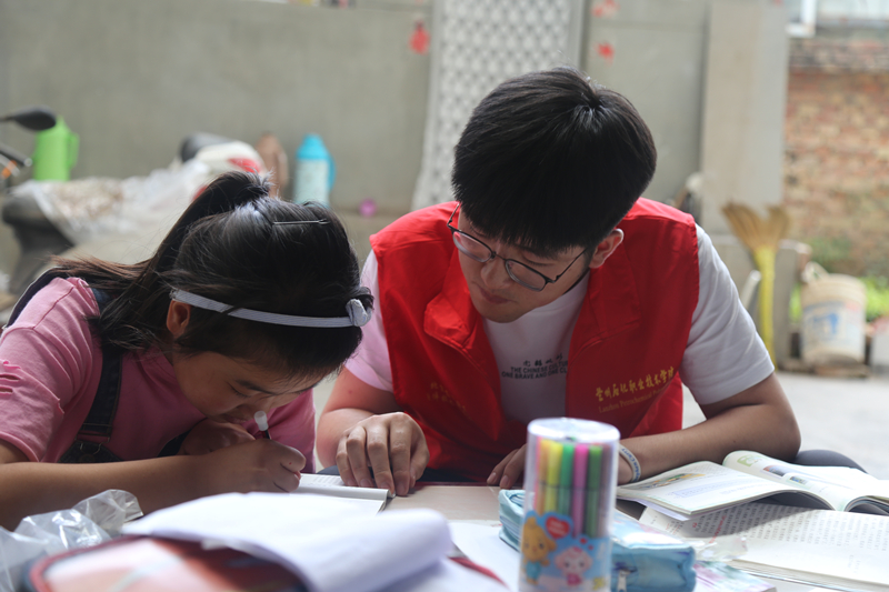 三下乡的过程中,在走访了琥珀乡内大多数的村民后,志愿者们发现村内外出务工人员数量较多,因此,村内的儿童大多由家中老人照看,同时也的确存在家长无心照看孩子的现象。在村内的走访调查中,许多老人向队员反映自己识字不多,无力辅导孩子的假期作业;同时两代人年龄差距较大,在管理孩子方面也是“心有力而余不足。” 在随后几天的志愿工作中,志愿者们对琥珀乡内的留守儿童进行课业辅导,组织一些互动小游戏,寓教于乐,让这些留守儿童们在学习到知识的同时,还能获得陪伴和欢乐。
