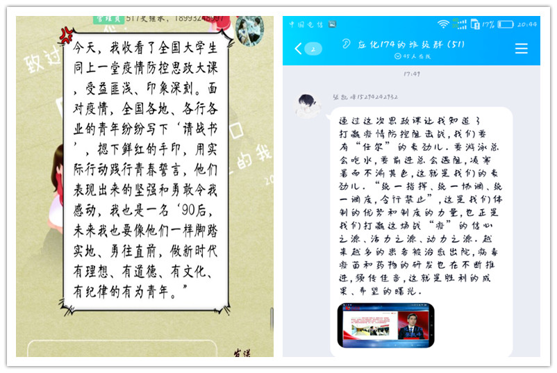 观看完“思政大课”后,同学们纷纷在班级群里畅所欲言发表感想。化工172班李锦莲感言道:“这是一堂别开生面的线上思政课!作为新时代青年,我们要让青春梦想在民族复兴的潮流中尽情绽放!”。恒力181班史继承留言说:“今天,我收看了全国老员工同上一堂疫情防控思政大课,受益匪浅、印象深刻。面对疫情,全国各地、各行各业的青年纷纷写下‘请战书’,摁下鲜红的手印,用实际行动践行青春誓言,他们表现出来的坚强和勇敢令我感动,我也是一名90后,未来我也要像他们一样脚踏实地、勇往直前,做新时代有理想、有道德、有文化、有纪律的有为青年。”