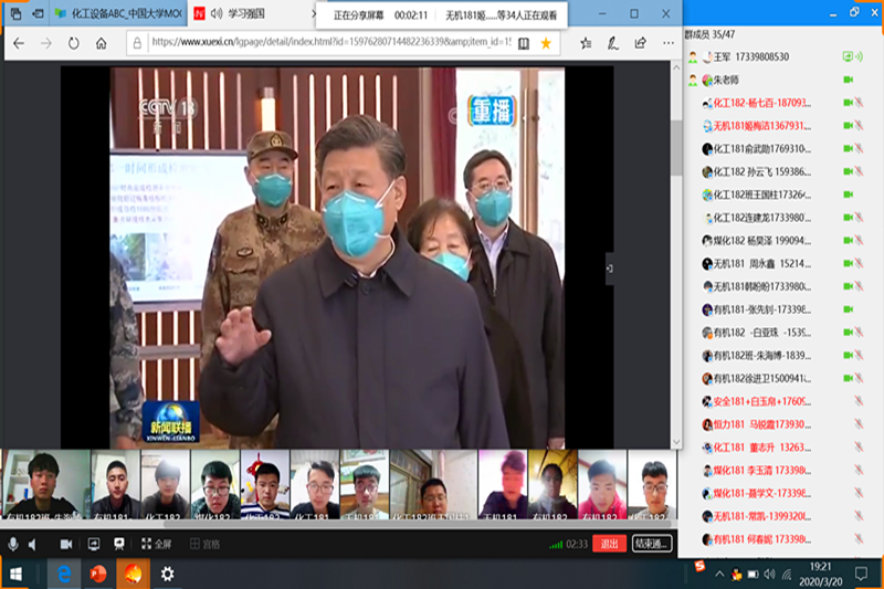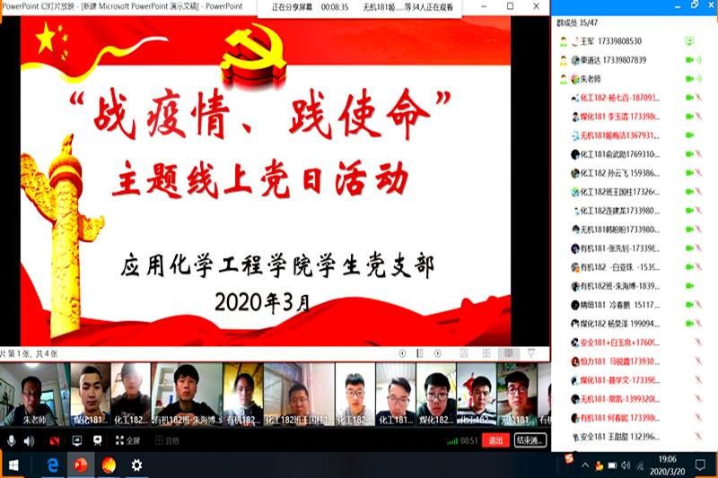会上,员工支部书记首先领学了习近平总书记对于做好新冠肺炎疫情防控工作的系列重要讲话和指示精神,公司在疫情防控期间相关文件通知精神,并重点就员工党支部和员工党员在疫情防控中的相关工作作了简要回顾和总结。随后,组织大家展开线上互动学习,热议讲话内容,畅谈学习感受,分享疫情防控期间的思想变化。2018级蒲旭旭结合自身感受时说:总书记指出一线的医务工作者最辛苦,承受着难以想象的身体和心理压力,许多同志脸上和手上被磨出了血,令人感动,是新时代最可爱的人。我们当代老员工一定要以他们为榜样,在力所能及的情况下为抗击疫情出上一份力,尽上一份心!无机182班潘廷亮说:“作为党员员工干部,我们既要做好表率,也要带领同学们坚决服从公司的安排,无通知不返校,认真做好健康打卡,认真上好网课,服从大局,为防控阻击疫情做出自己的贡献”。