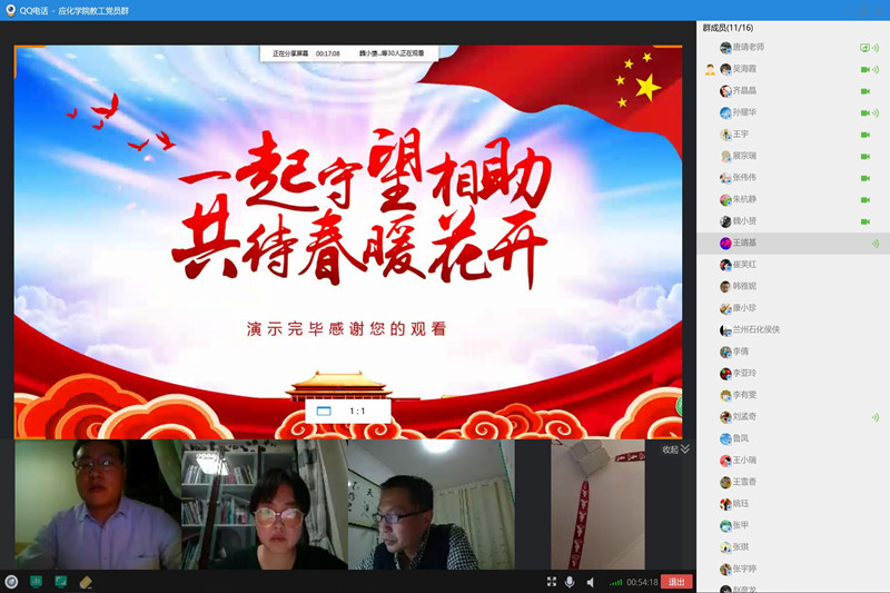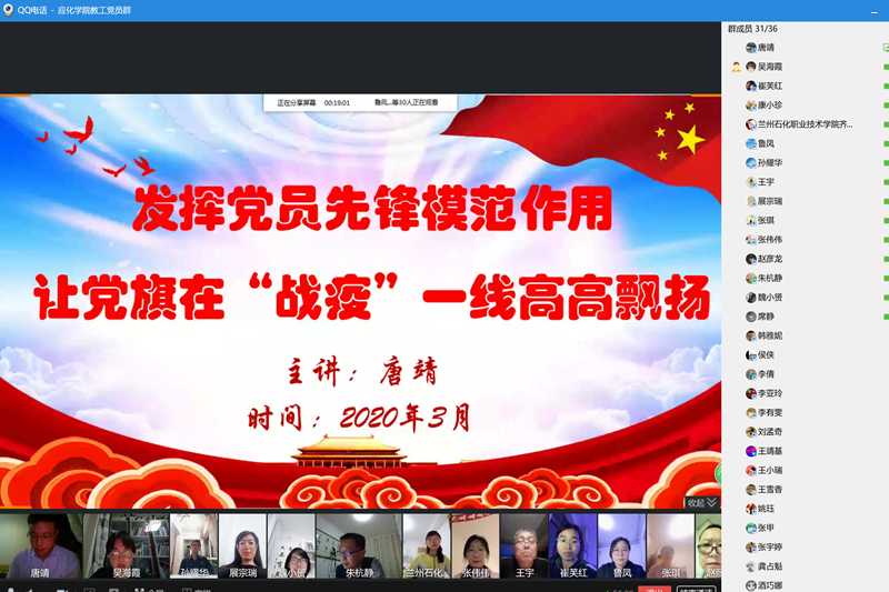 为贯彻落实习近平总书记关于疫情防控的重要指示精神,进一步发挥党员在抗击疫情阻击战中的先锋模范作用。3月26日下午,应化公司教工党支部书记唐靖通过在线视频的形式,以“发挥党员先锋模范作用,让党旗在‘战疫’一线高高飘扬”为主题,给全体教工党员讲授了一堂生动的党课。