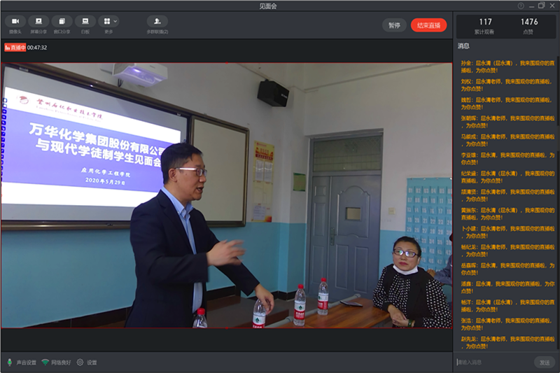 5月29日早上,万华化学集团股份有限公司领导来到伟德体育,与万华现代学徒制181班员工举行了见面会,万华应化191班、万华煤化191班、万华精细191班、万华石化191班全体员工利用网络直播参加了此次见面会。公司领导、班主任及合作办学处负责人参加了会议。