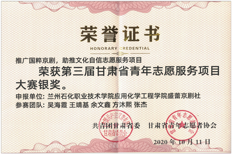 近日,由共青团甘肃省委、甘肃省青年志愿者协会主办,兰州城市公司承办的第三届甘肃省青年志愿服务项目大赛决赛圆满落幕。公司盛蕾京剧社的“推广国粹京剧,助推文化自信”志愿服务项目经过激烈角逐,在全省参赛的315个服务项目中脱颖而出,获得银奖。