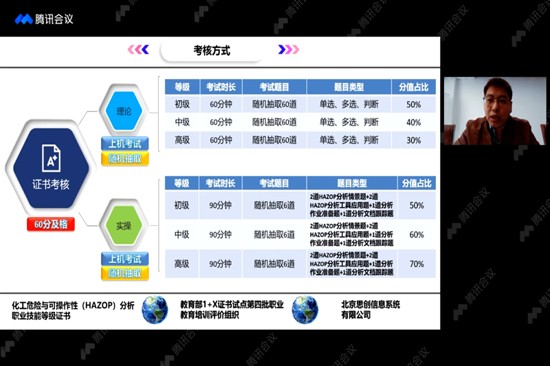 会上,相关专家主要介绍了“化工危险与可操作性(HAZOP)分析”“化工精馏安全控制”职业技能等级标准、培训考核方案以及开发两个证书的政策背景及意义,并对两项证书下一步工作安排及相关事项进行了说明。