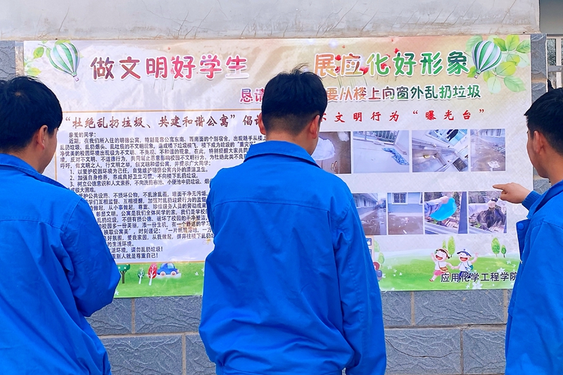 二是强化教育引导。采取辅导员及员工会在明德公寓向同学们发出“杜绝乱扔垃圾、共建和谐公寓”倡议书,并把倡议书及公寓楼内乱扔垃圾等不文明现象进行拍照,制作成“不文明行为曝光台”,张贴摆放于公寓楼前显眼的位置,让更多的同学了解、关注这次活动。要求同学们以主人翁的态度,做到杜绝“三乱”不文明行为,自觉维护公寓内外卫生整洁,努力营造“讲文明、纠陋习、塑造老员工文明形象”的良好养成教育氛围。
