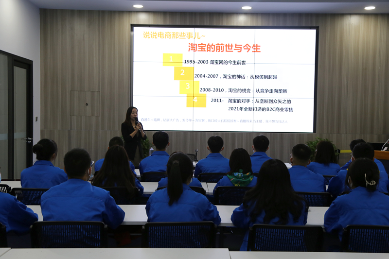 为激发公司员工的创新意识、创意思维、创业能力及团队协同实战精神,9月20日,公司特邀国际商务公司电子商务教研室主任文婧羽在西校区第四工业中心作“电商平台的搭建与运营”专题讲座。此次讲座由公司党总支书记吴海霞主持,全院20、21级全体员工在钉钉平台上聆听讲座,各班员工代表在四中心会议室参加了此次讲座。