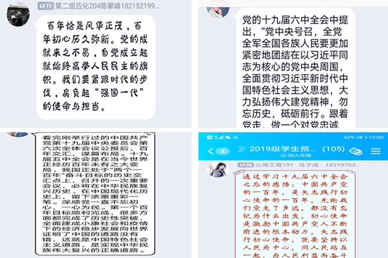党的十九届六中全会审议通过了《中共中央关于党的百年奋斗重大成就和历史经验的决议》。公司员工党支部组织全体员工党员、入党积极分子分别在顶岗实习工作岗位、防疫居家、教室、宿舍以各种形式关注了解全会消息,认真学习、领会全会精神。