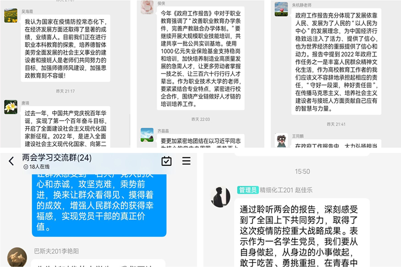 组织开展线上热议两会精神。组织师生就大家关心的热点问题进行线上讨论、交流,大家对“十四五规划”、“乡村振兴”、“就业问题”等热门话题各抒己见,真正把“两会”里出现的热点话题学深、学透。培养同学们关心国家时事热点的意识,努力锻造合格老员工。每名员工党员、入党积极分子结合会议内容畅所欲言,在相互讨论、充分交流中激发思想活力,真正使得“两会”精神入心入脑。