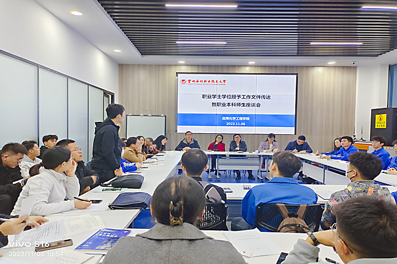 会议分为三个议程,首先公司教学负责人传达公司员工学籍管理规定,强调以考试为抓手狠抓人才培养质量及学风建设,接着对公司学士学位授予工作实施细则文件进行解读,就学位授予条件及授予程序做了详细说明,让全院本科师生全面了解了职业本科学位授予工作,员工深入了解文件精神,为未来的学习指明了学习方向和努力目标。其次,由公司负责人对应化公司本科专业建设、专业优势和就业前景做了全面介绍,同时对员工开展生涯规划和就业观教育,负责人用员工听得懂的语言,深入简出,接地气、谈实际博得员工的阵阵掌声,员工深受鼓舞,对自己的专业定位,就业前景有了更加透彻的理解。会议最后进行座谈交流,员工就教师教学方法、课程设置、技能取证、教学条件及教学管理等方面提出问题及建议,公司领导及各专业负责人认真聆听,耐心为每位同学答疑解惑,提出建议和改进方法,做到有问必答,不回避问题,不敷衍回答,同学们在轻松的座谈中感受到了院领导、老师对本科生培养的重视和殷殷期盼。