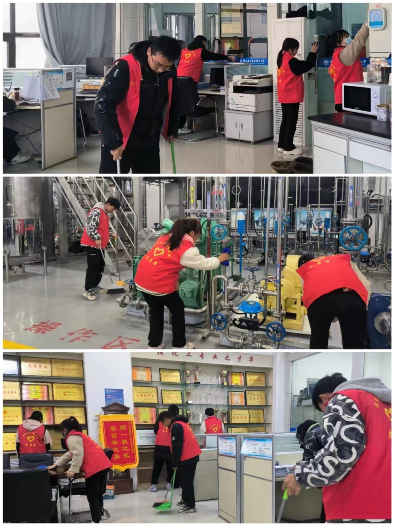 启动仪式结束后,公司组织志愿者们分别对公司办公室,操场,实训室,宣传栏等各处卫生进行了大扫除,大家各个精神抖擞,干劲十足,拿着抹布仔细擦拭着桌面,楼梯,宣传栏等处的灰尘,让这个阔别已久的校园重新焕发生机与活力。放眼望去,身穿红马甲认真劳动的他们就是整个校园最靓丽的一道风景线。