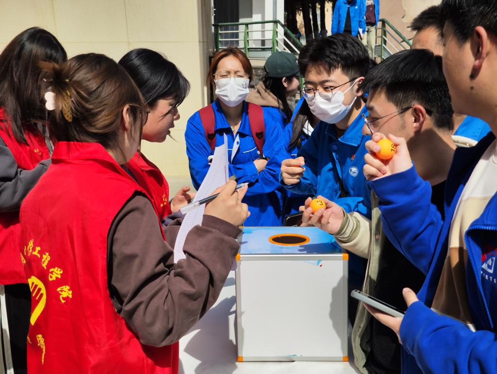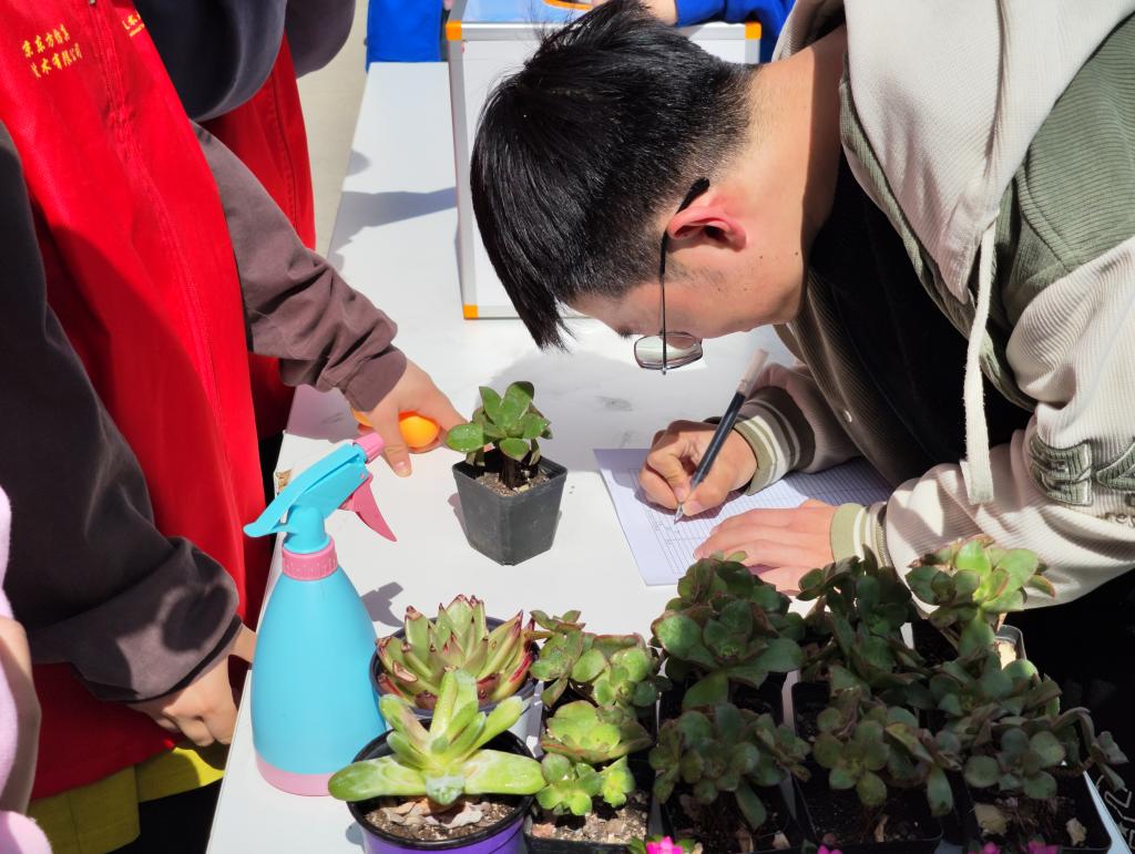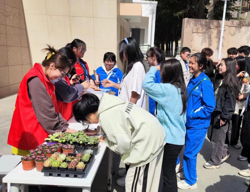 活动前期,志愿者们将植树造林、绿色环保、文明校园等相关知识融入一个个小问题中,用奖励多肉盆栽的方式鼓励同学们积极回答问题并通过海报宣传,成功引起了同学们的好奇心,调动了同学们参与此次活动的积极性;活动期间,许多爱好绿植的同学纷纷来到领养现场,积极排队抽签,参与答题互动,签字领取“小野玫瑰”、“天女扇”、“吹雪”等多肉,活动现场热闹非凡,同学们有因领到自己心仪的绿植而欢呼雀跃的,也有因为答错题错失机会而感到遗憾的,大家都纷纷表示很喜欢这样的活动,觉得很有意义。