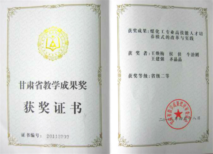 2012年《煤化工专业高技能人才培养模式的改革与实践”》获甘肃省教学成果奖省级二等奖